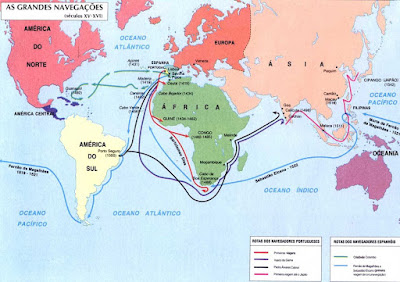 - Importante observar e compreender que o mapa registra as grandes navegações iniciadas por Portugal e Espanha no século XV, tendo os oceanos Atlântico e Índico como principais rotas, para se chegar à Índia, considerada a principal fonte de especiarias.